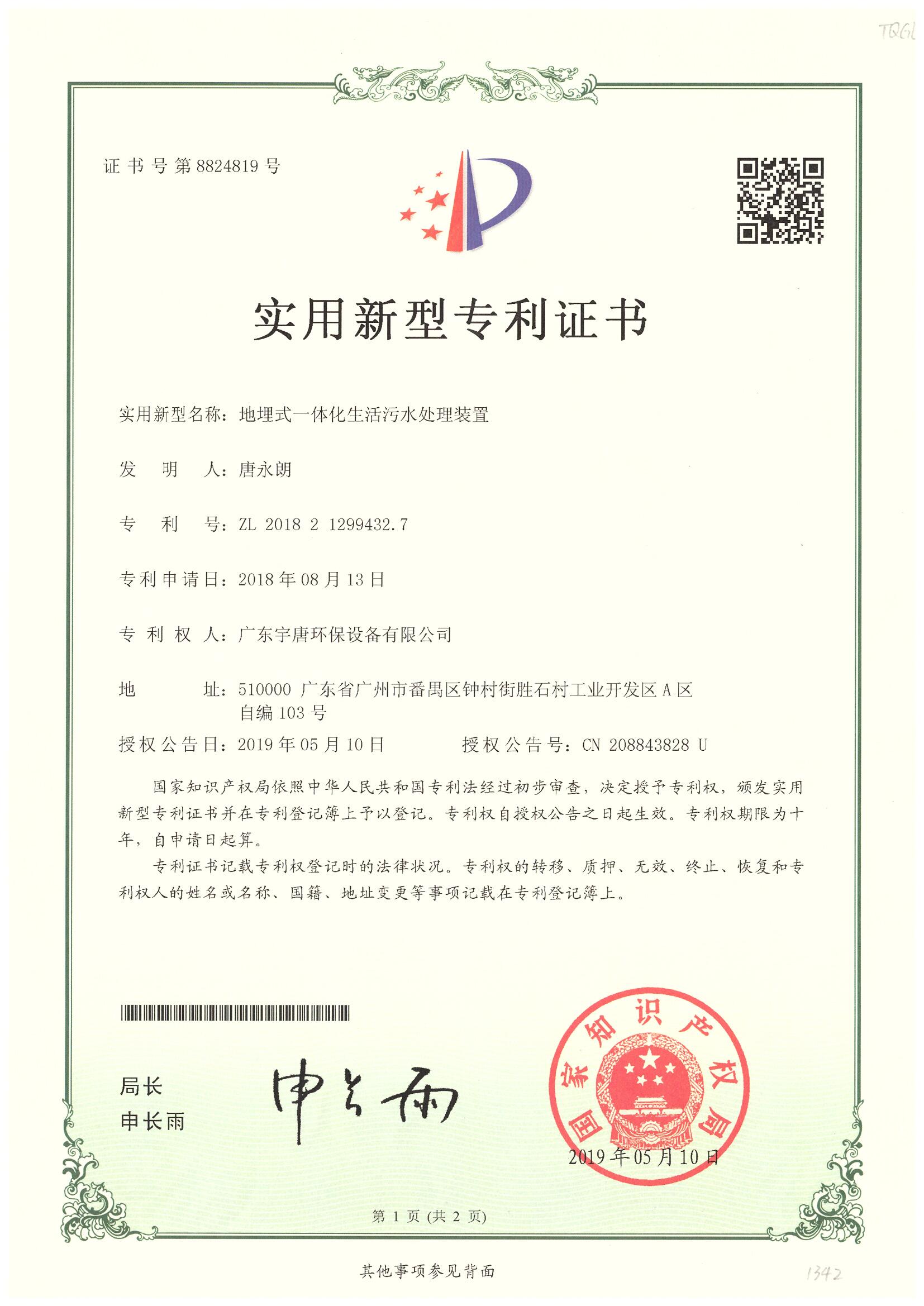 地埋式一體化生活污水處理裝置實(shí)用新型專利證書